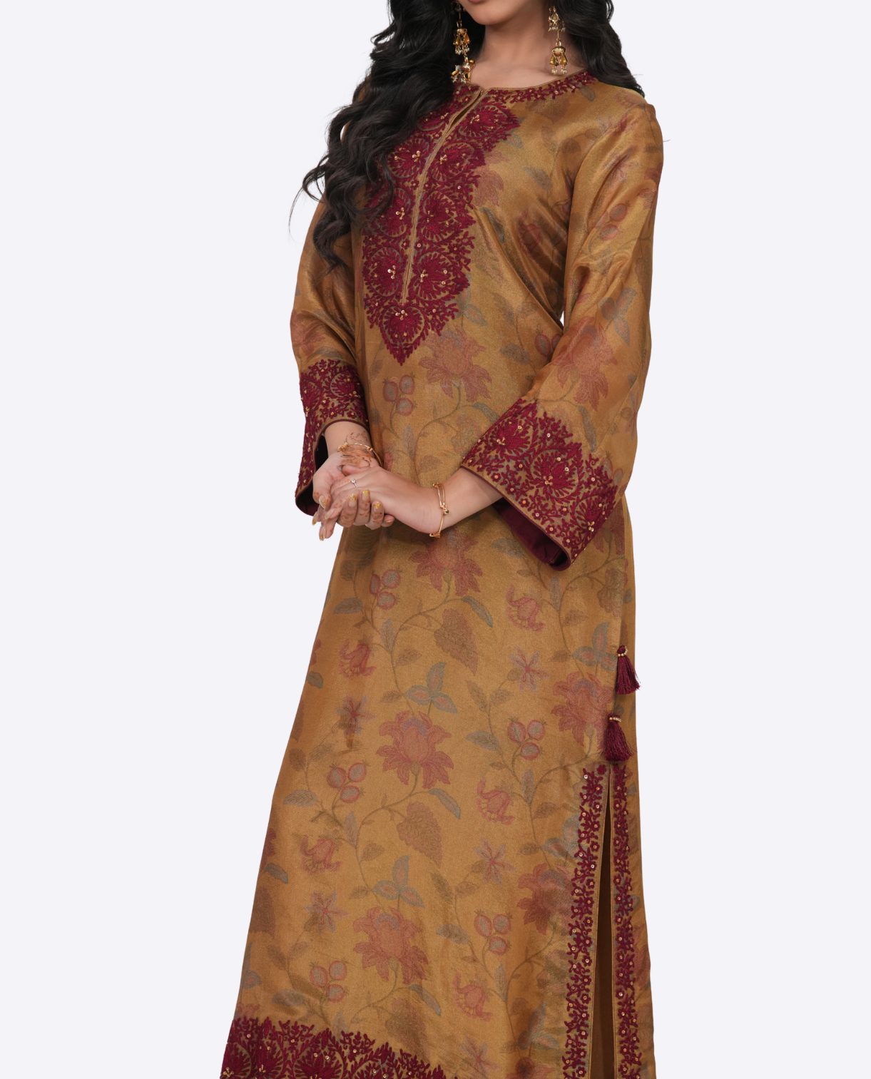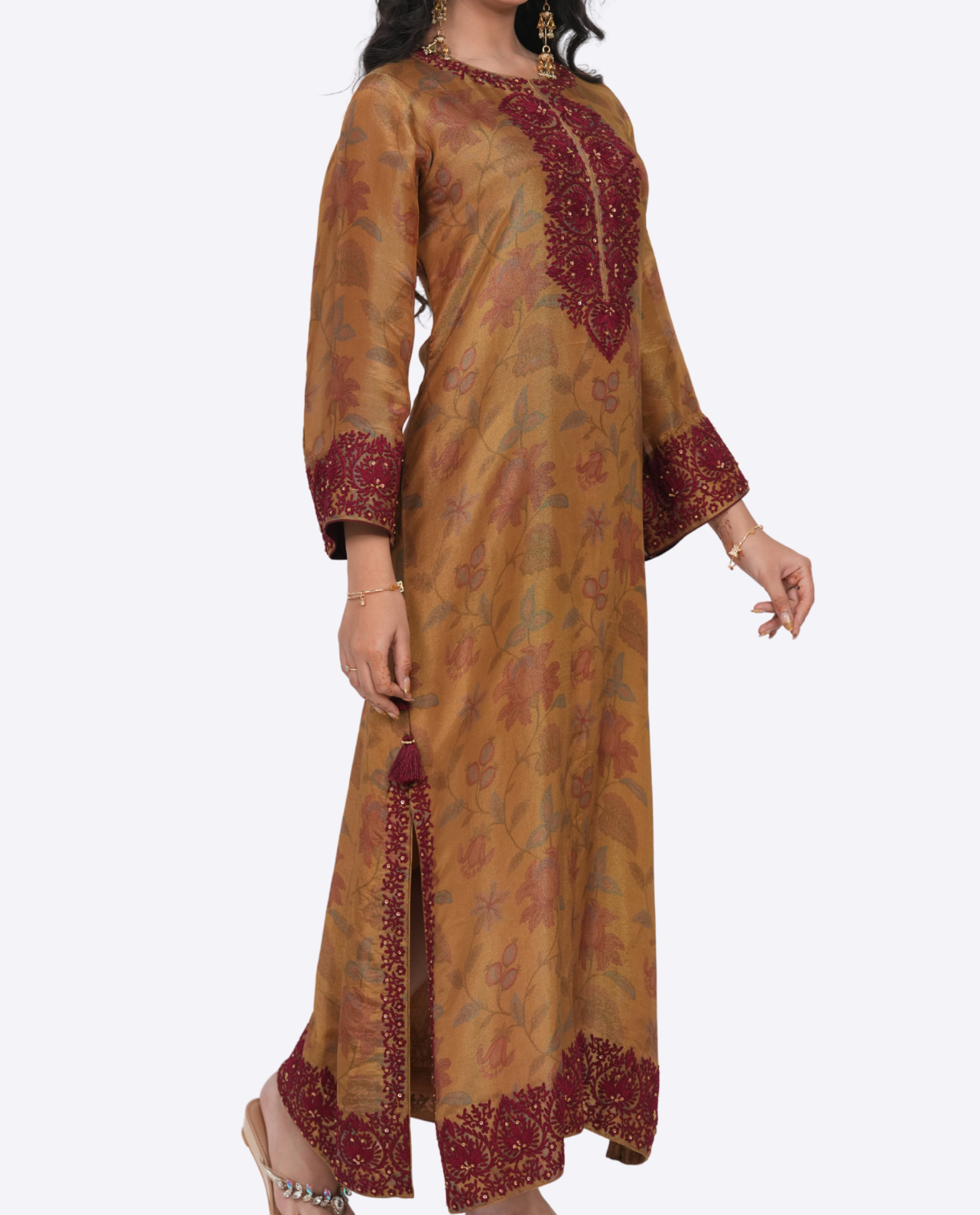 Print tissue long length kaftaan with Dori work embroidery