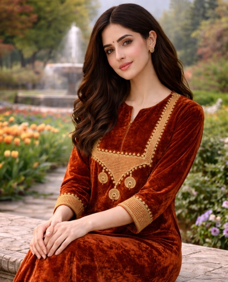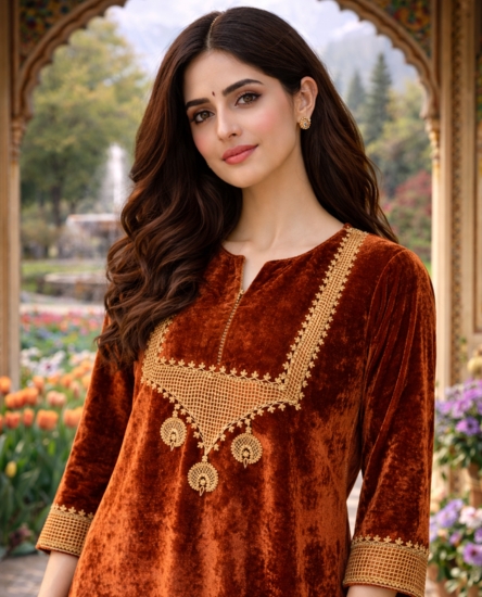 This piece consists of a pure velvet kurta and a check salwar in modal